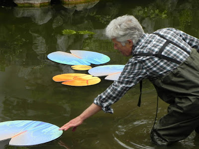 Enjoy the natural movement of the round paintings as they float atop the water -- affected by currents, breeze, rain and the movement of birds and insects in the garden environment.